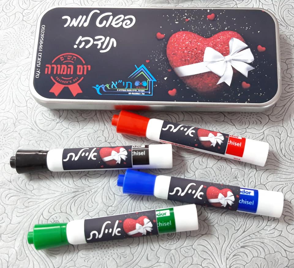 מארז קופסת פח איכותית עם מיתוג והקדשה אישית למורה הכולל: